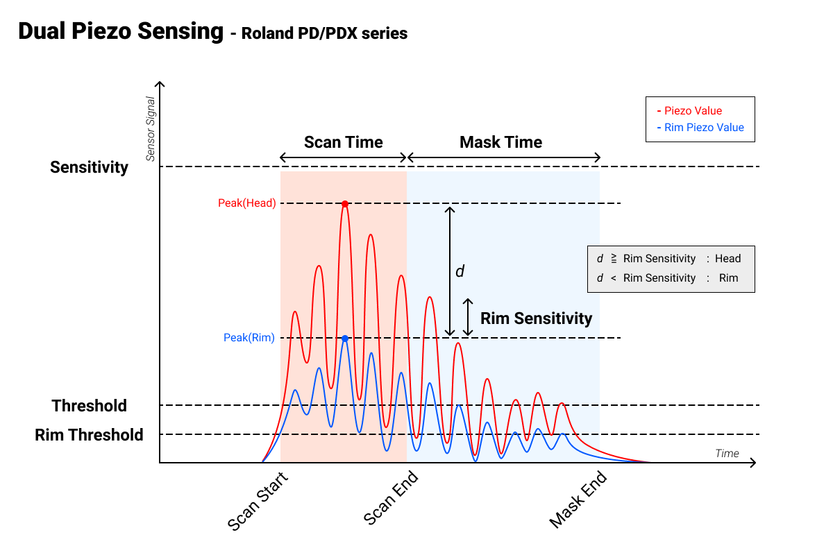Since it's piezo sensing, it's basically the same as single piezo sensing. By comparing the signals from the piezo for the head to the piezo for the rim, we can determine which part of the pad was hit. On most pads, when the head is hit, the piezo for the rim also vibrates. Similarly, the piezo for the head vibrates when the rim is hit. The difference(d) between the peak of the piezo for the rim and the peak of the piezo for the head is used to judge. This can be set in rimSensitivity.
