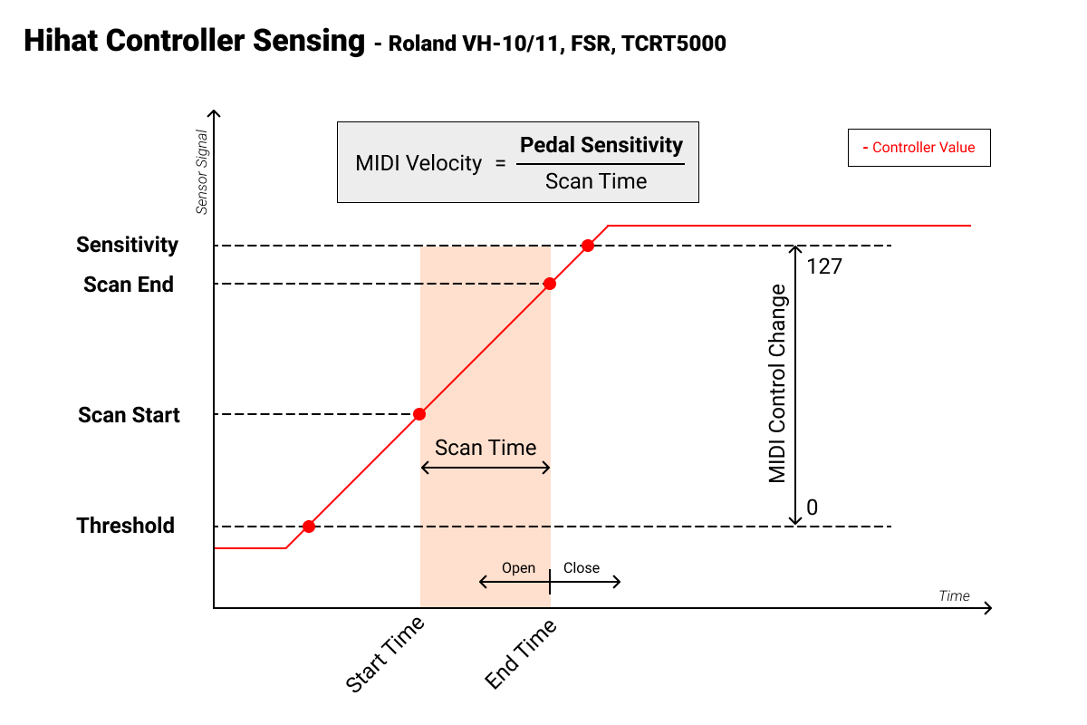Whether it's the FSR, the infrared sensor (TCRT5000), or Roland's VH-10, they are the same. Record the time you started closing the hi-hat and the time you finished closing it. Then, the time it took to close the hi-hat is converted to the velocity. Only ScanStart and ScanEnd and PedalSensitivity are relevant to the velocity. The MIDI CC value can be set in the Sensitivity and Threshold. Velocity Curve here is only applied to MIDI CC values.